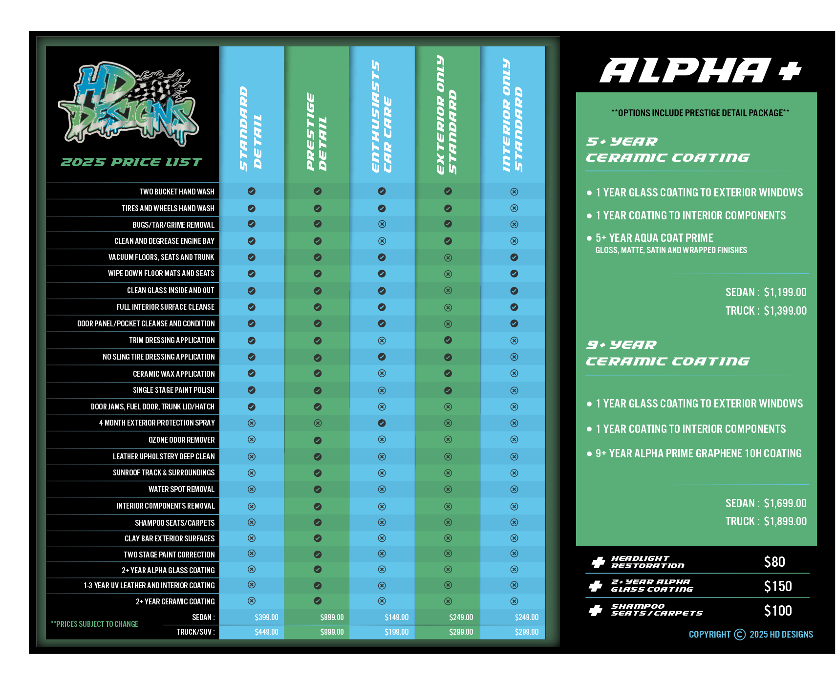 Protect your investment with our Alpha+ Ceramic Coating packages, trusted by car owners across Central Pennsylvania. Options include a 5-Year Ceramic Coating (with Aqua Coat Prime for gloss, matte, satin, or wrapped finishes) or our 9-Year Graphene Ceramic Coating with Alpha Prime Graphene 10H for maximum durability. Both include a 1-year glass coating and interior protection. For the best ceramic coatings in Mechanicsburg, PA, nothing matches this level of shine, UV defense, and scratch resistance.